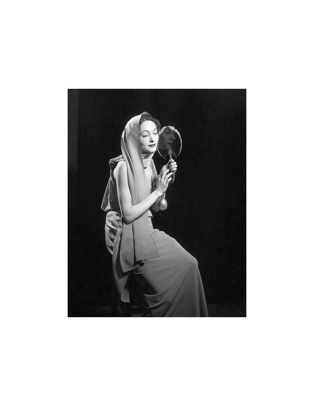 Nusch Eluard, femme tenant un miroir dans lequel se reflète son visage, dans une robe de Schiaparelli