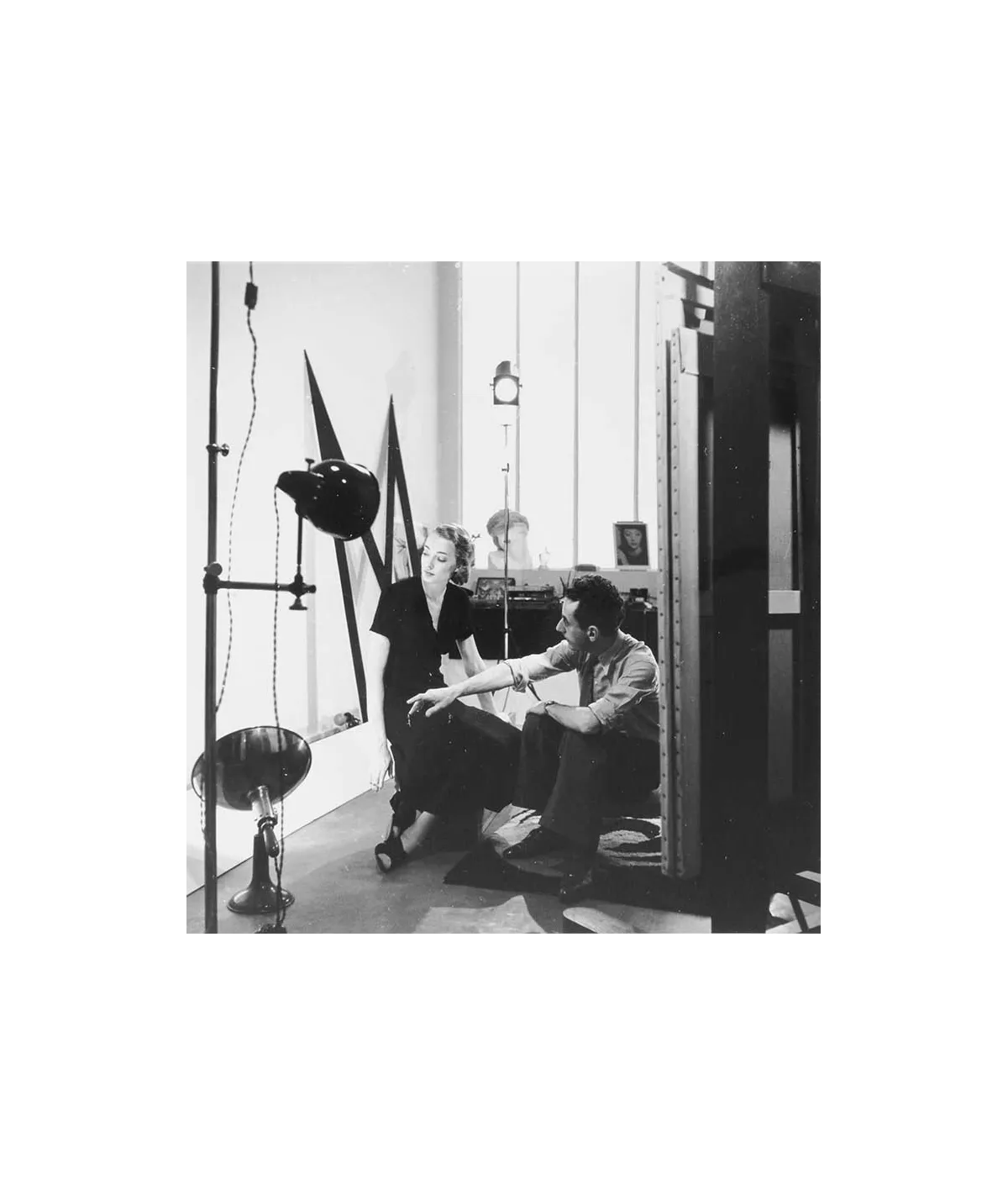 assis dans son studio dirigeant un modèle et entourés de projecteurs, photo de Roger Schall