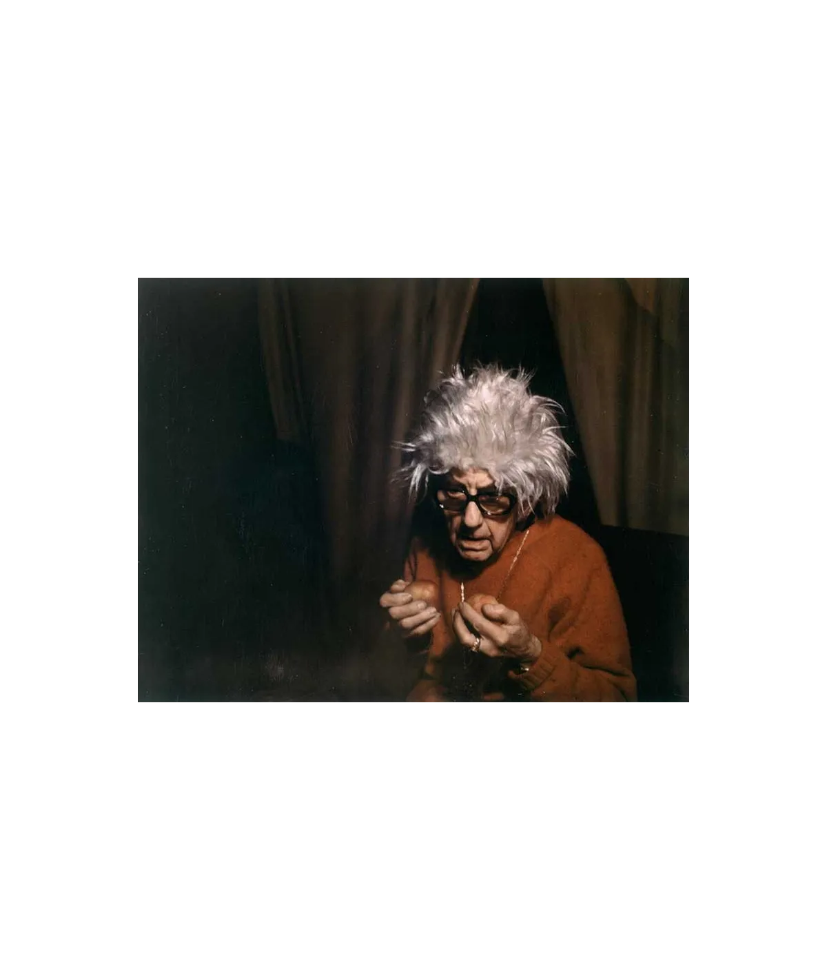 portrait déguisé avec perruque blanche, une pomme dans chaque main placée au niveau de la poitrine - couleur