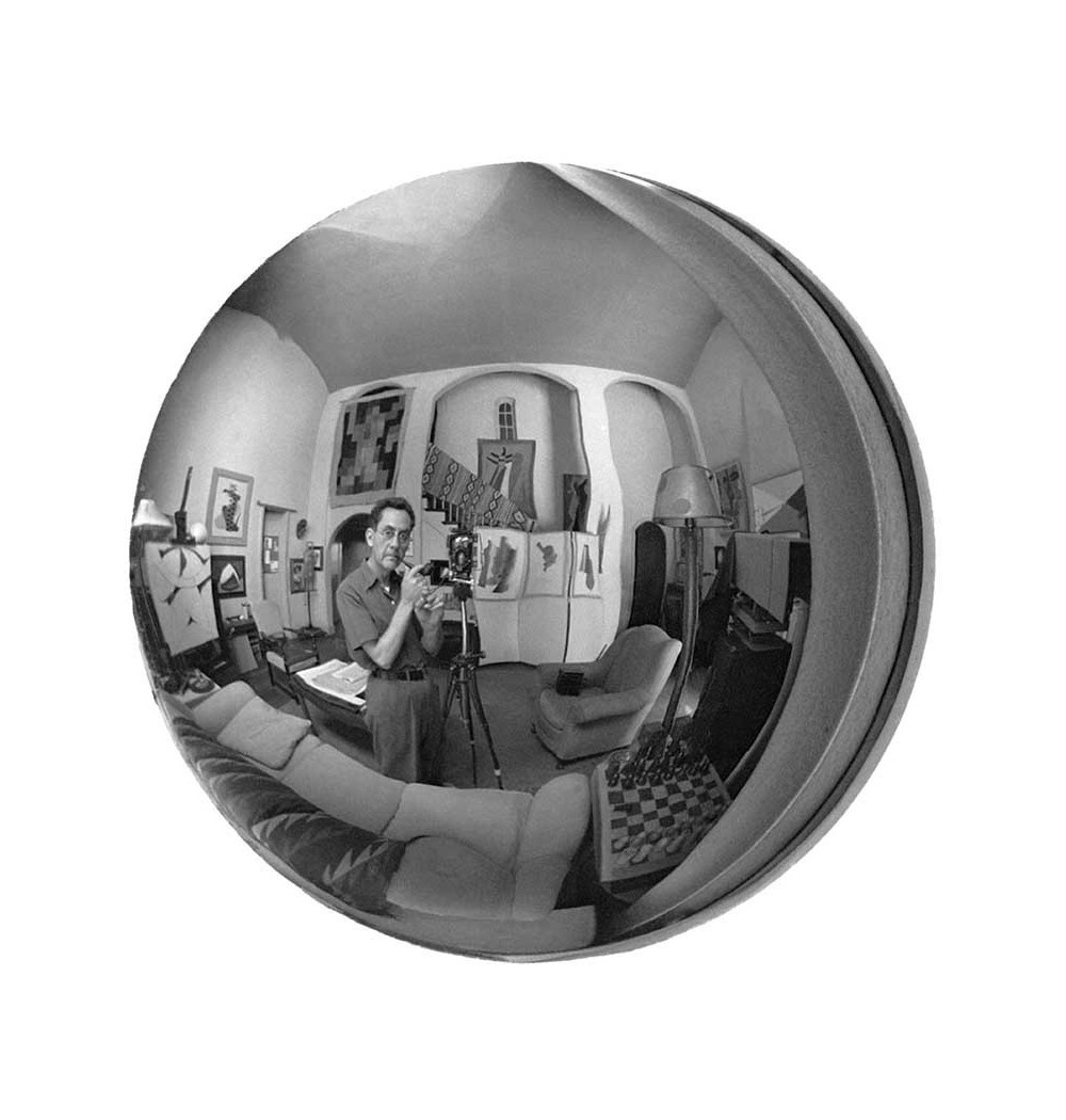 Studio d'Hollywood Wine Street en réflexion dans une boule, Man Ray pipe à la bouche