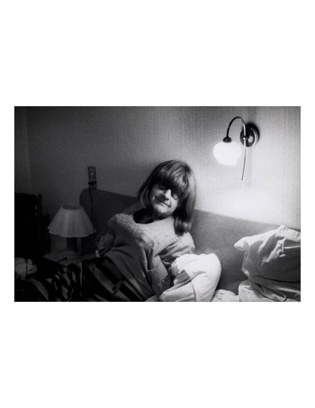 Man Ray travesti avec perruque au lit, mains sous le pull pour former poitrine