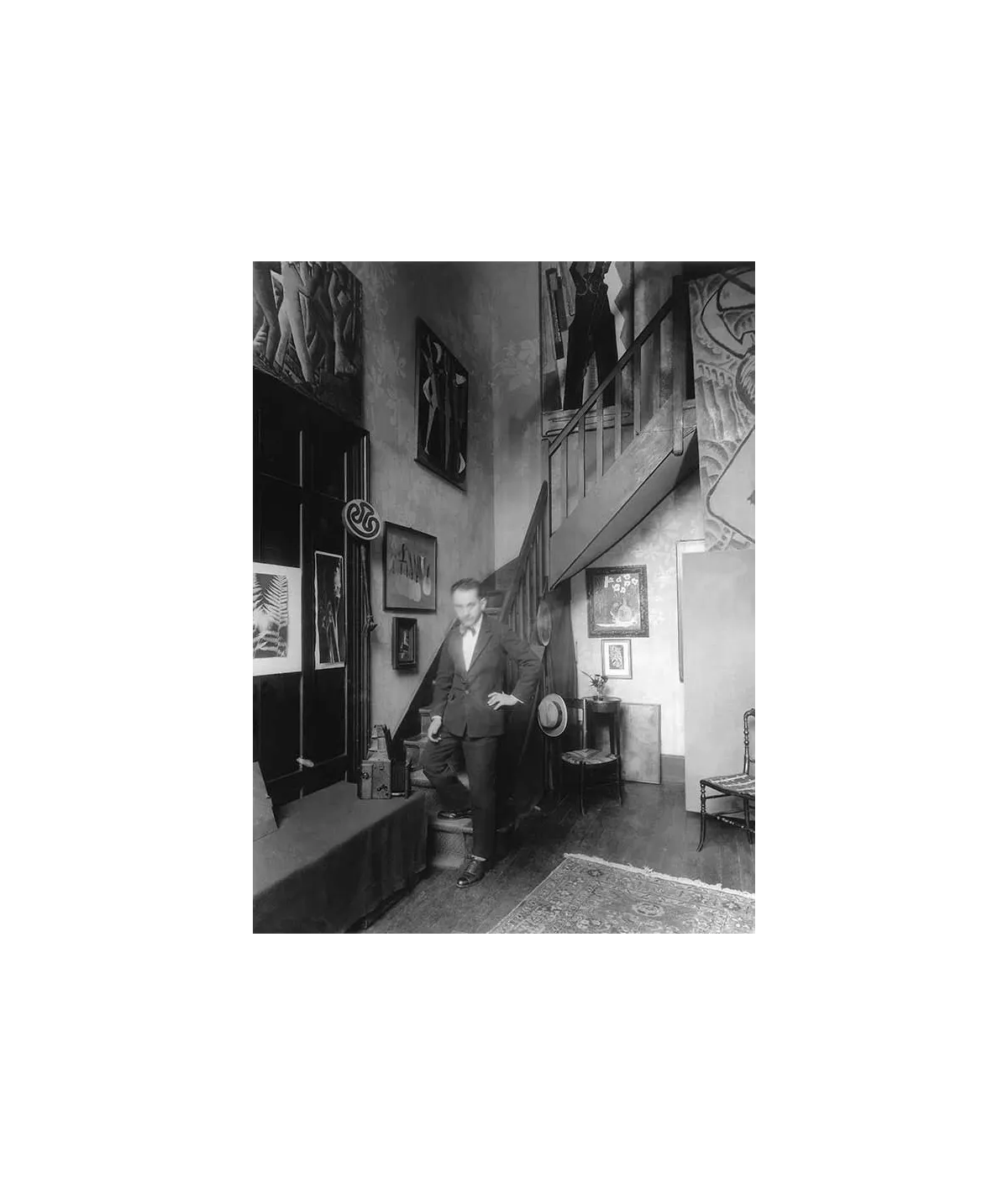 Man Ray dans son atelier 31 bis rue Campagne Première devant l'escalier