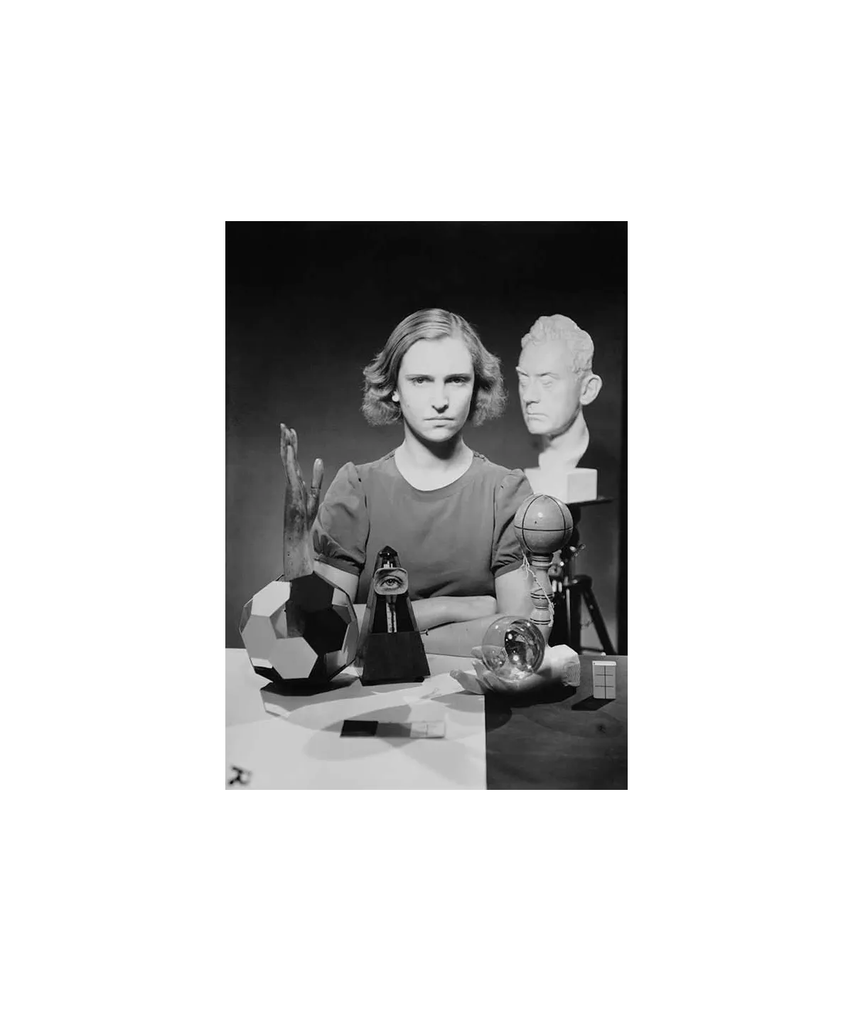 femme de face bras croisés sur une table couverte d'objets (non-euclidien, objet indestructible) et du masque en plâtre de Man Ray