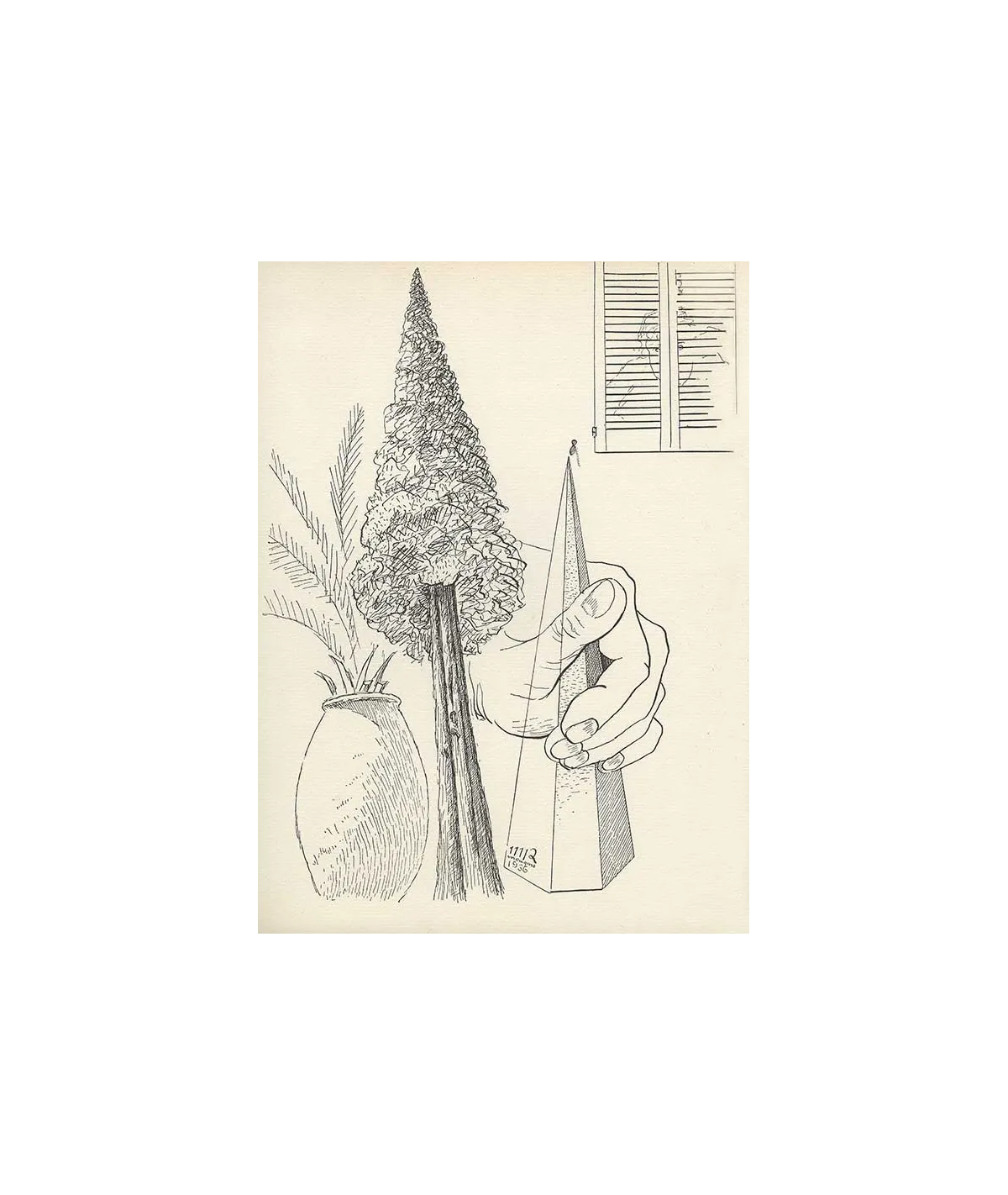 Pot de fleur avec palmier, conifère élancé if, pyramide hexagonale tenue par une main, volet avec persiennes en haut à droite