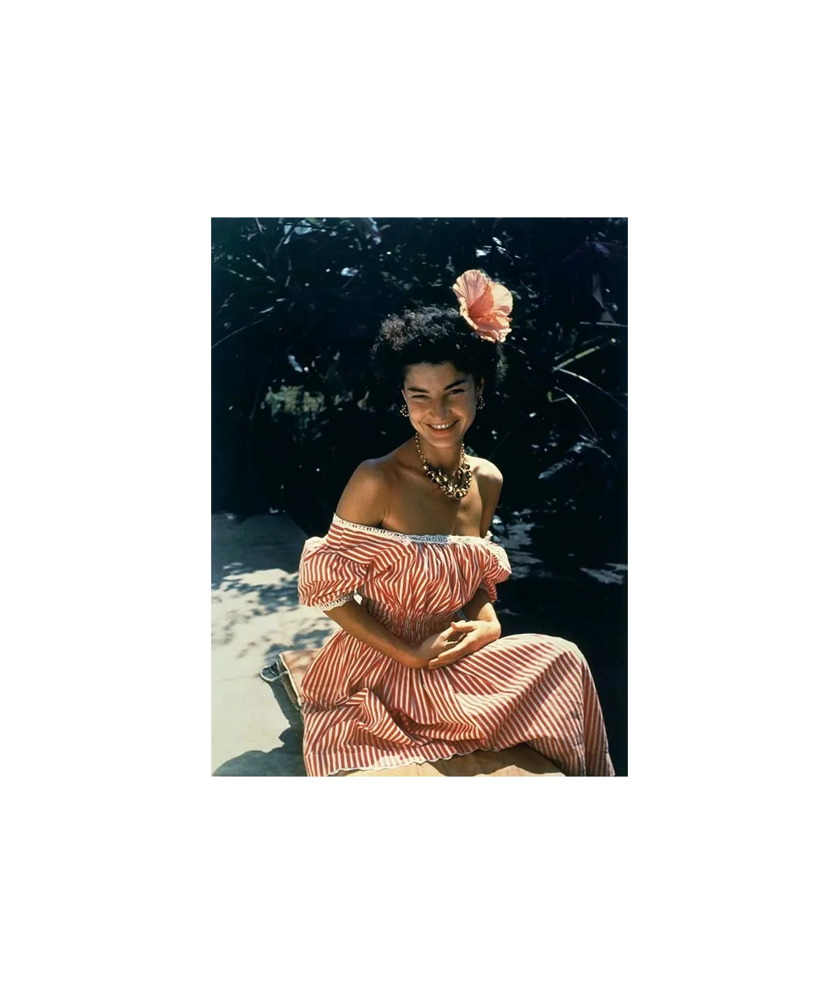 portrait femme robe décolletée et fleur dans les cheveux souriante en extérieur - couleur