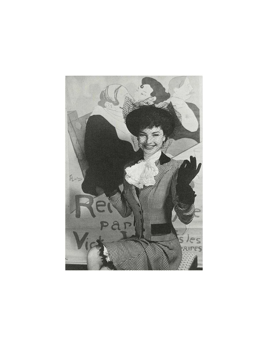 portrait femme assise tailleur et chapeau à voilette devant affiche de Toulouse-Lautrec