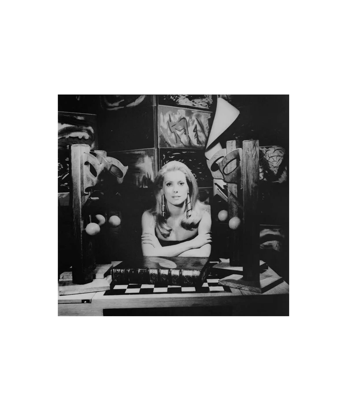 femme assise, lampshade en boucle d'oreille, de face bras croisés entourée d'objets de Man Ray