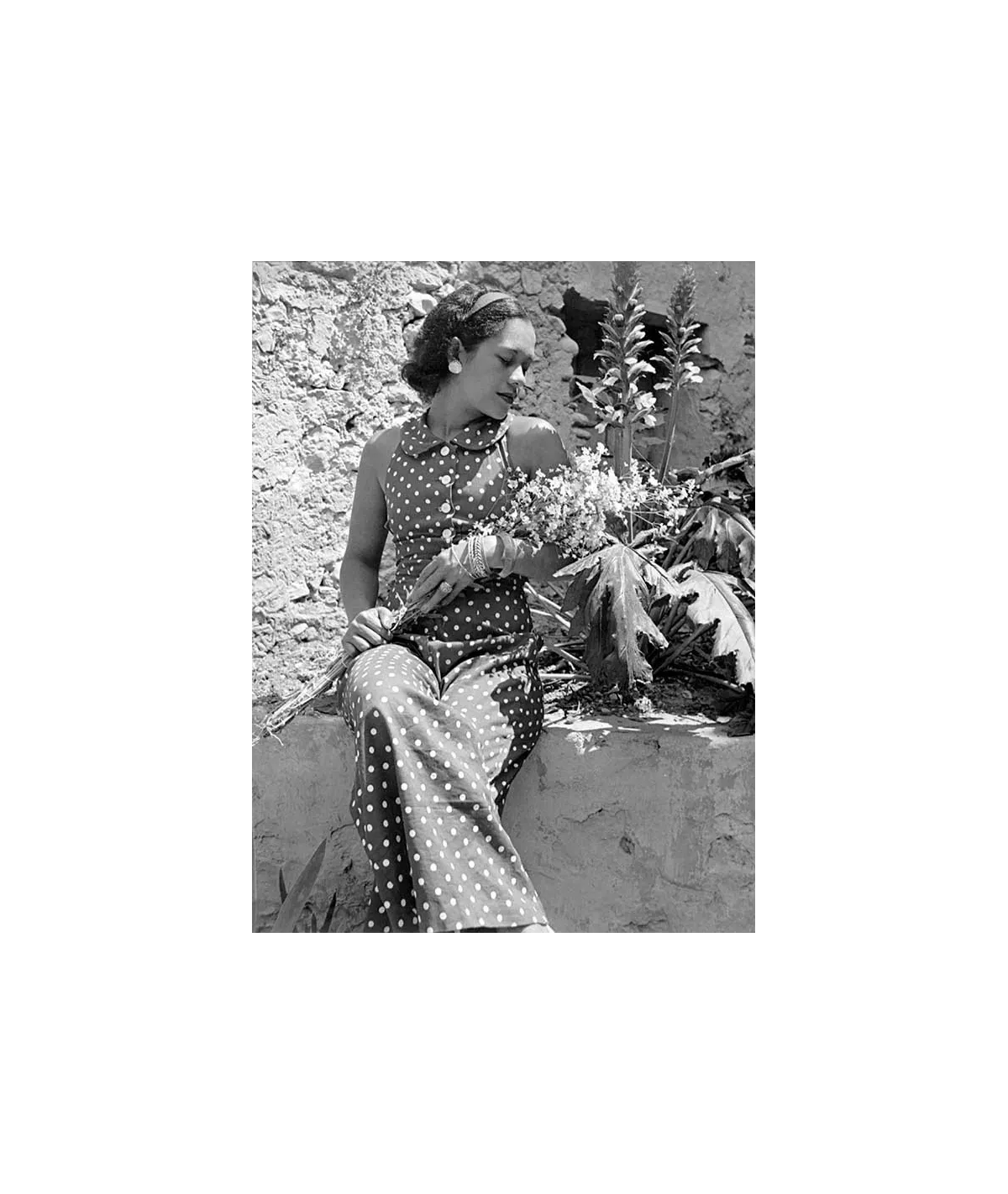 Ady (Adrienne Fidelin) avec robe à pois, portant fleurs dans les mains, à Antibes