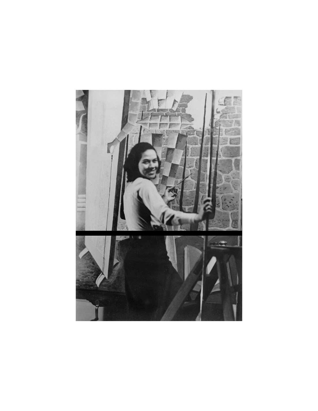 Ady souriante dans l'atelier de Man Ray devant le tableau "Le Beau Temps"