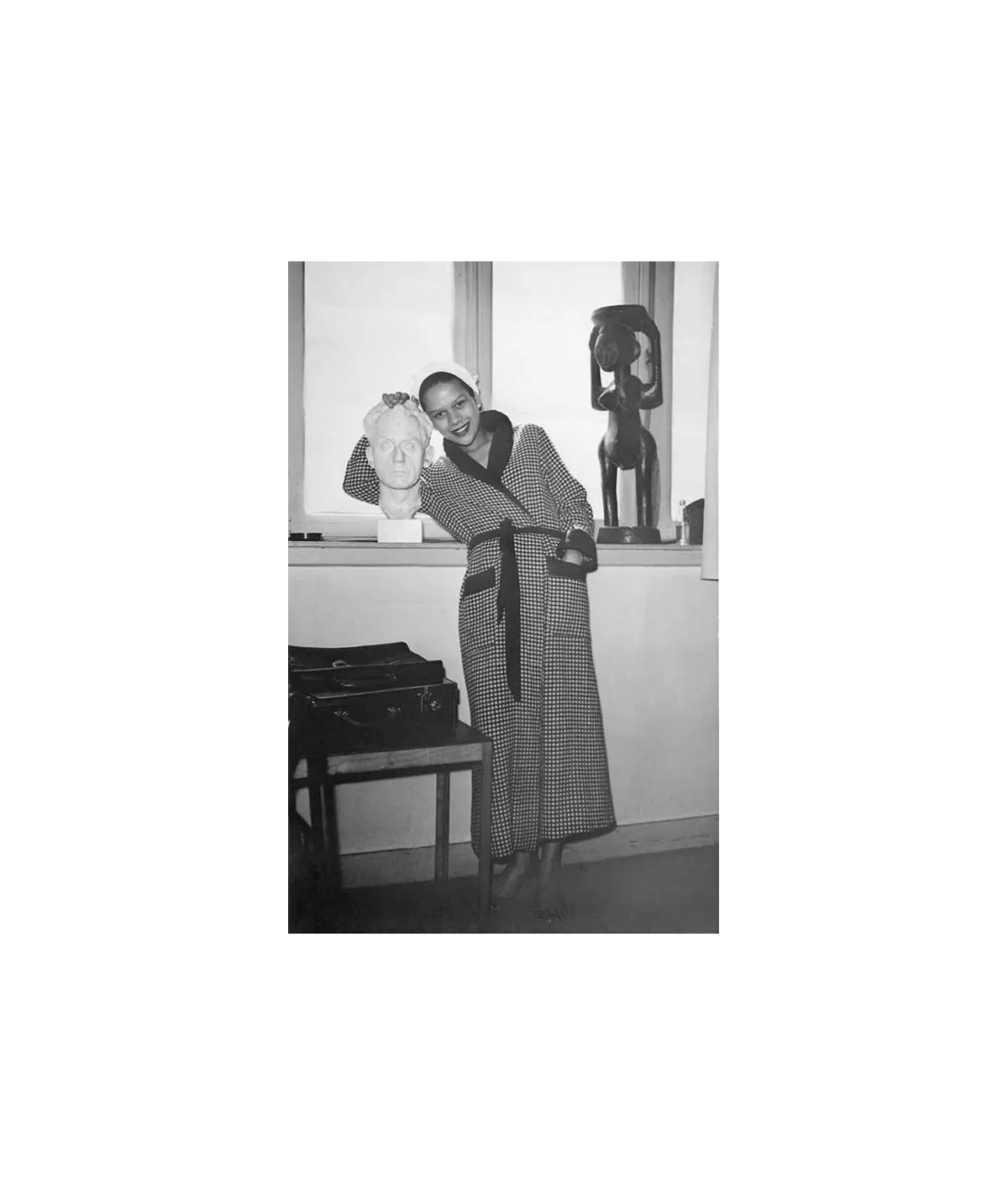 Femme souriante debout en robe de chambre posant de face, la main sur le masque en plâtre de Man Ray, statuette africaine en arrière plan