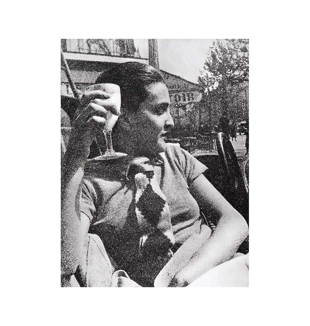 portrait visage de profil - tramée - à une terrasse de café, verre de bière à la main