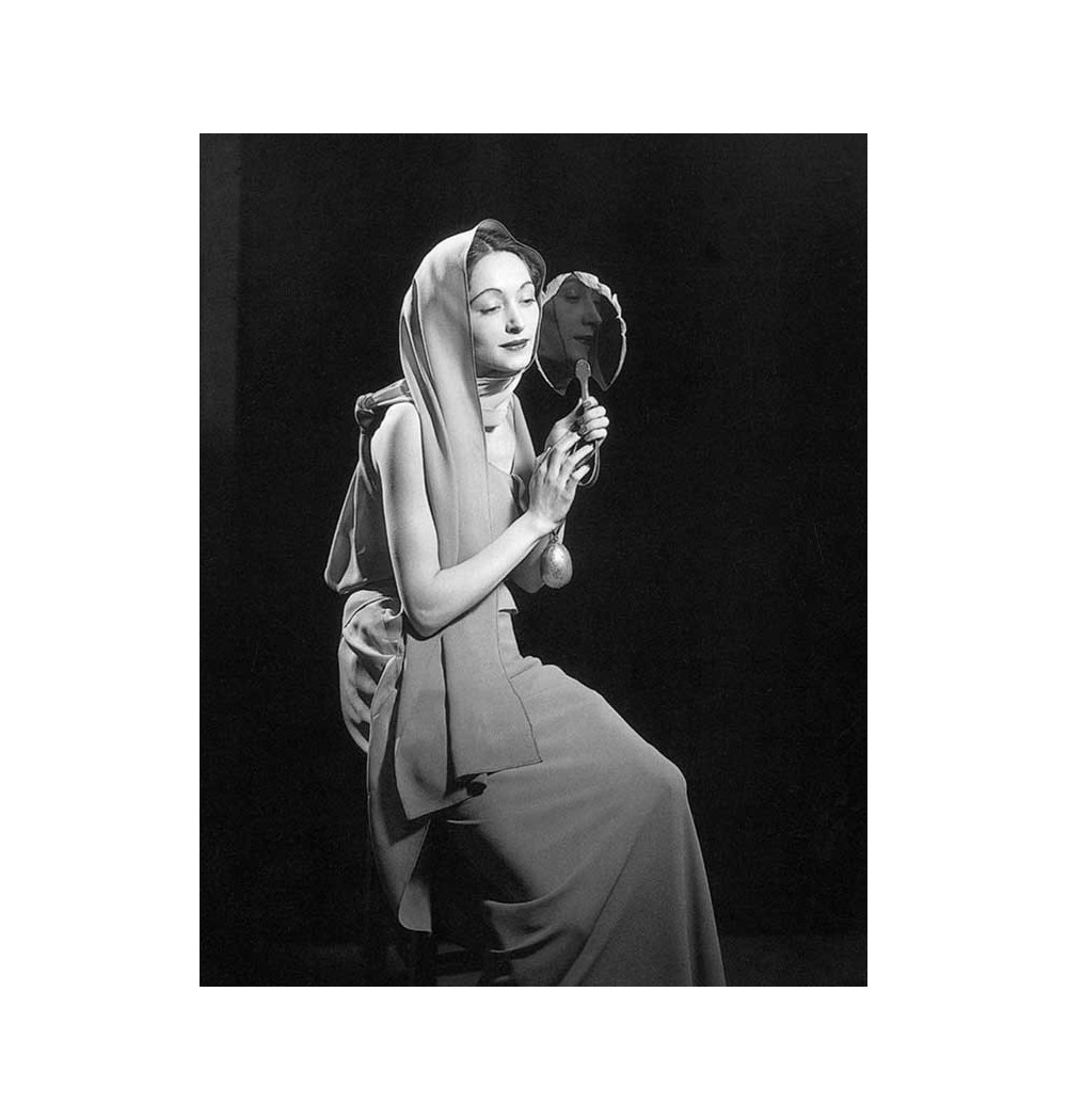 Nusch Eluard, femme tenant un miroir dans lequel se reflète son visage, dans une robe de Schiaparelli