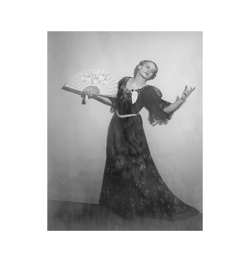 modèle en robe longue à dentelles un éventail à la main tête en arrière