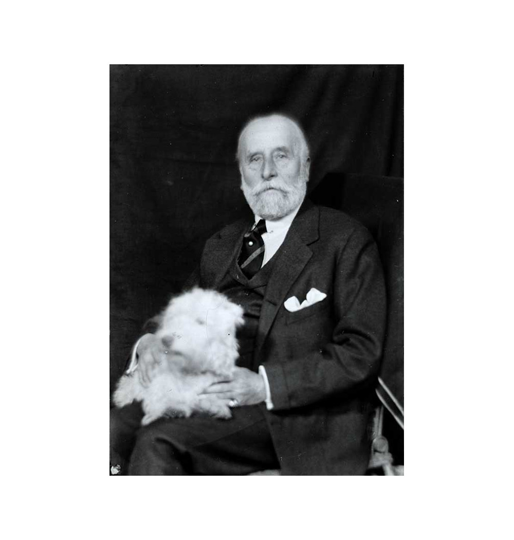 homme assis barbe blanche avec chien blanc sur les genoux - couturier