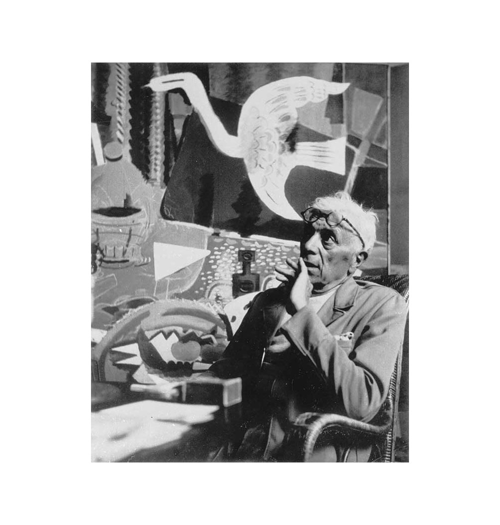 portrait du peintre assis dans son atelier avec son tableau en fond : Atelier VIII fait en 1949
