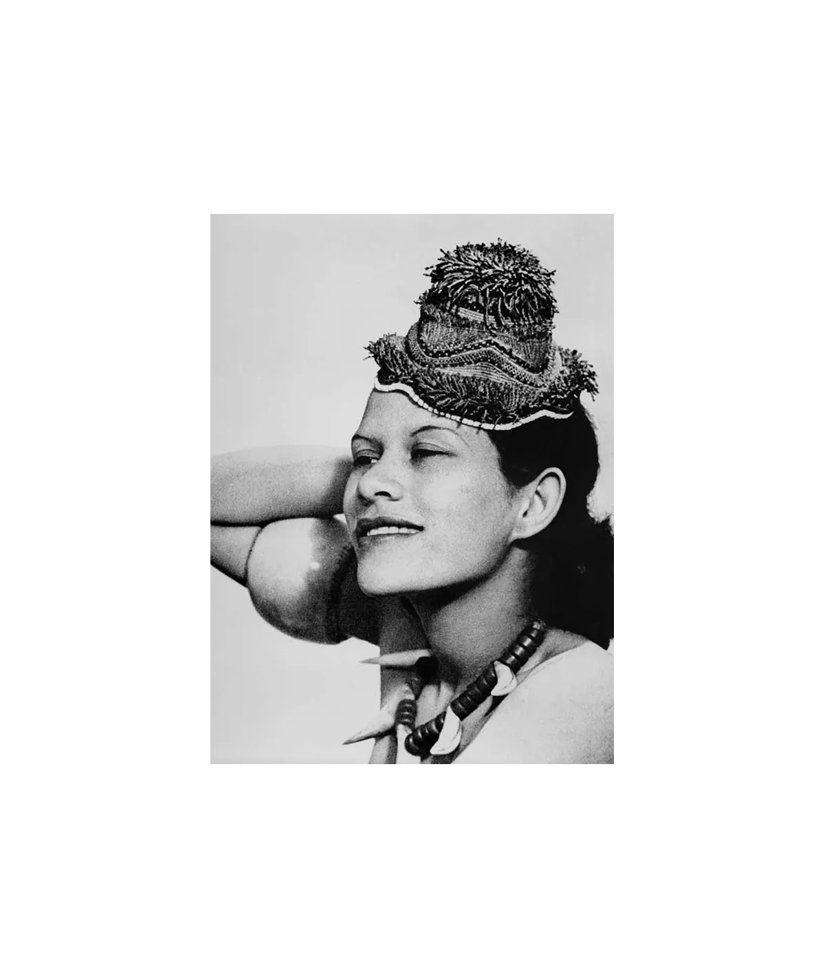Adrienne Fidelin, portrait visage souriante avec chapeau africain - publié dans Harper's Bazaar