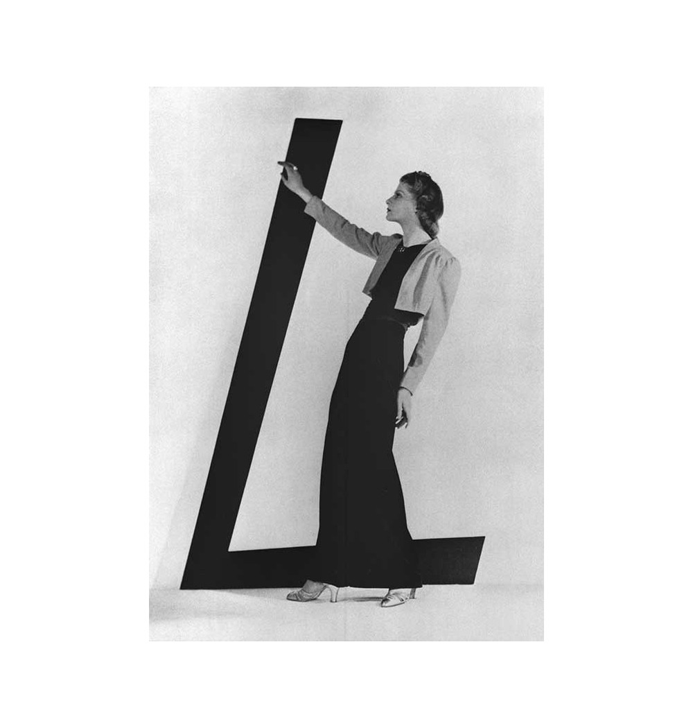 modèle en robe noire et gilet blanc devant la lettre L pour Lelong - publié dans Harper's Bazaar