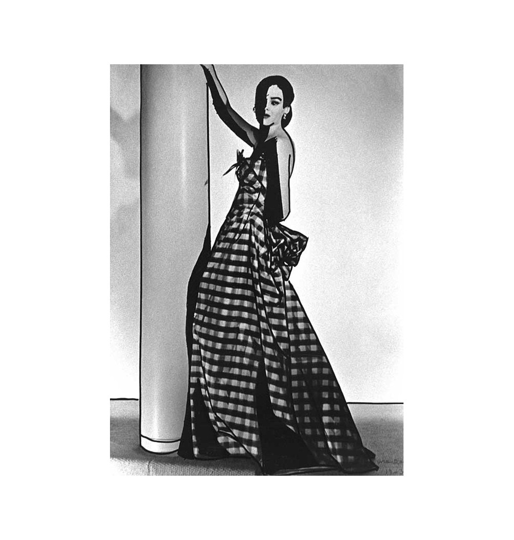 modèle en robe à carreaux de profil contre une colonne - vintage retouché à l'encre de Chine