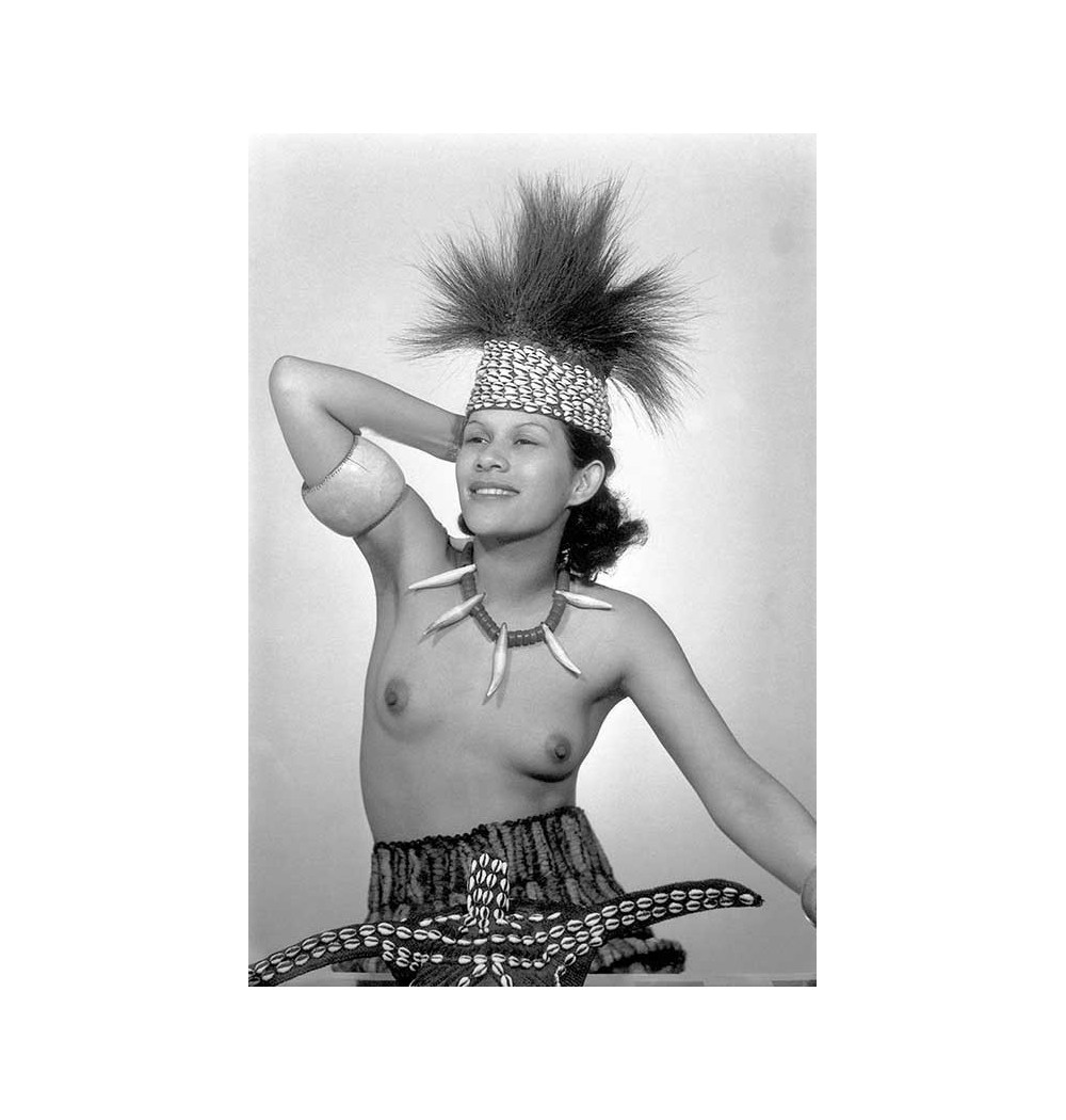 portrait bracelet au bras, chapeau africain avec coquillages, collier en dents de requin