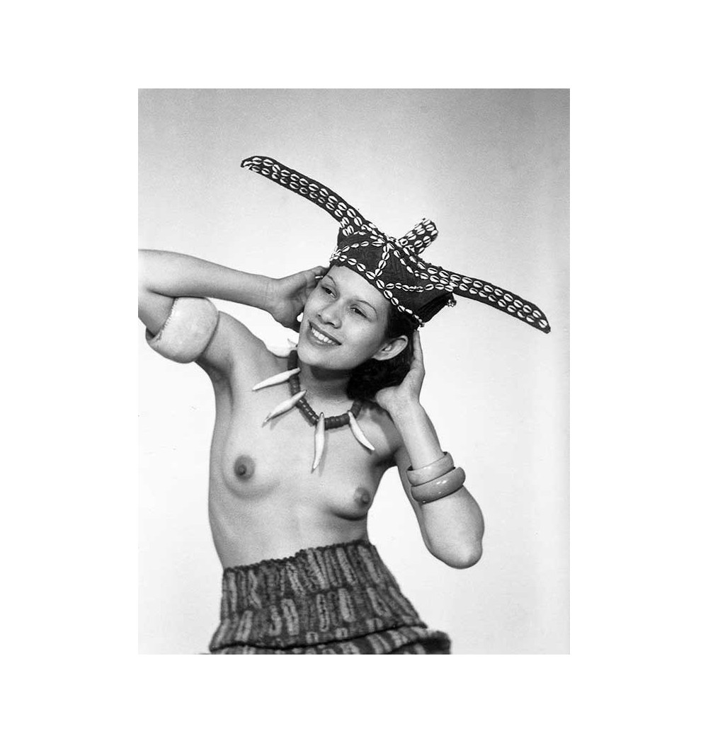 Ady torse nu de face, souriante, portant chapeau africain 2 cornes, avec coquillages et collier en dents de requin