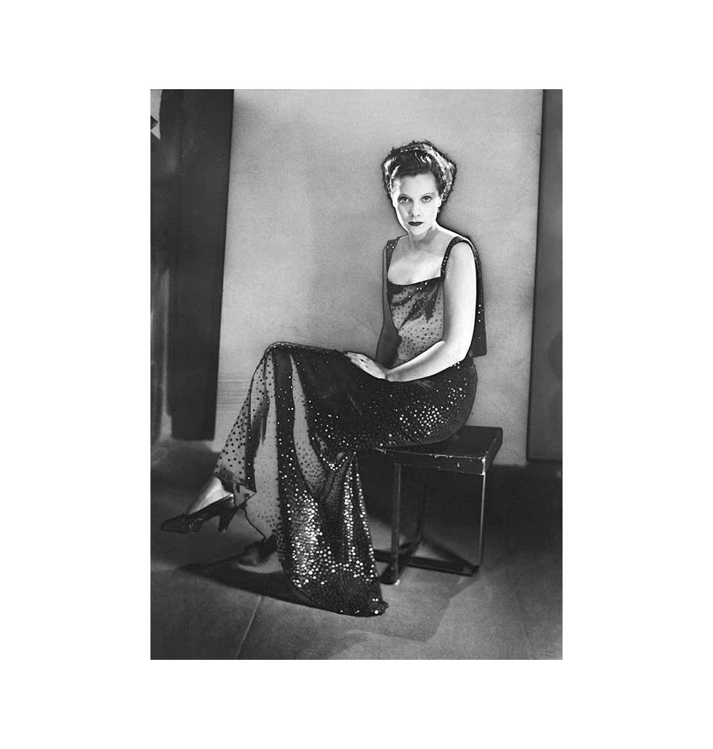 modèle assis portant une robe de Lucien Lelong - solarisation