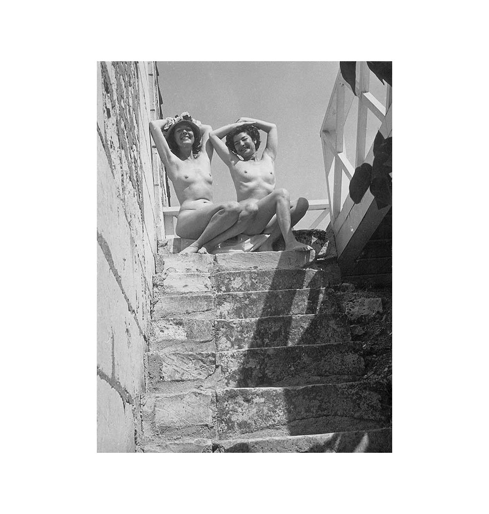 Juliet et Dorothea Tanning nues en haut d'un escalier en pierre, mains sur la tête