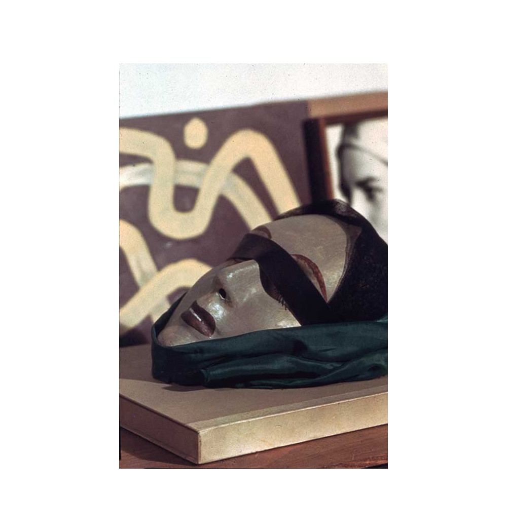 masque de carton avec yeux bandés de velours noir, collé sur le livre "Aline et Valcour" de D.A.F. de Sade