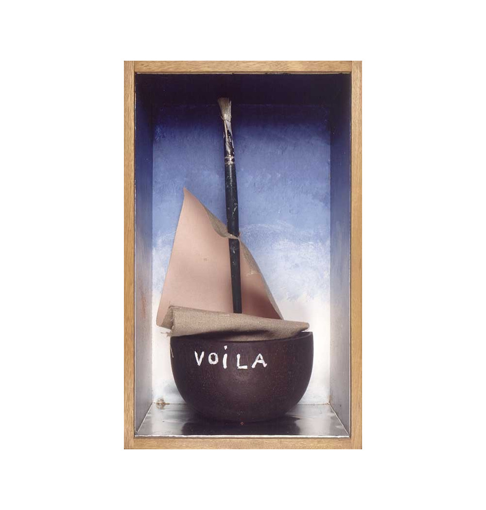objet - boîte en bois peint, voile réalisé dans toile rose, pinceau et coque en bois teinté.