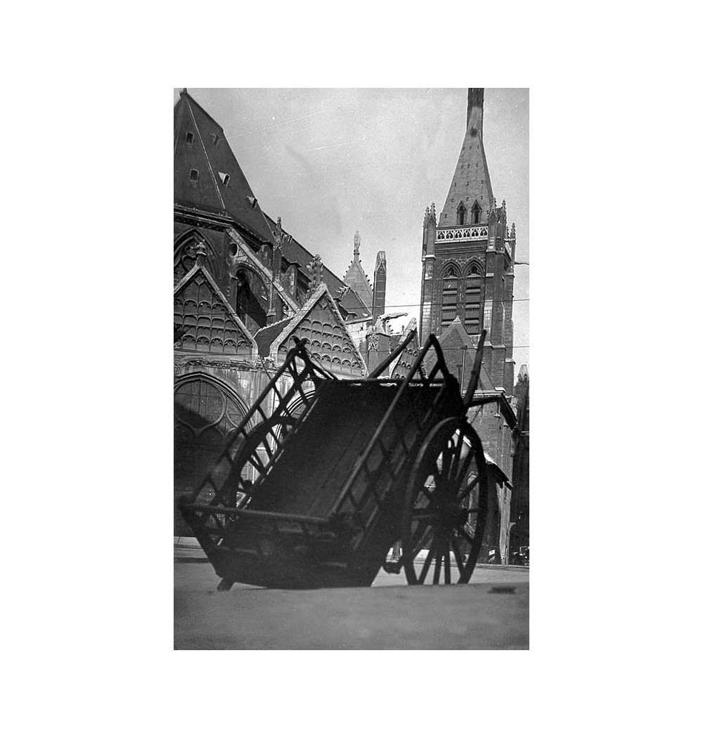 Charette dans une rue avec église dans le fond