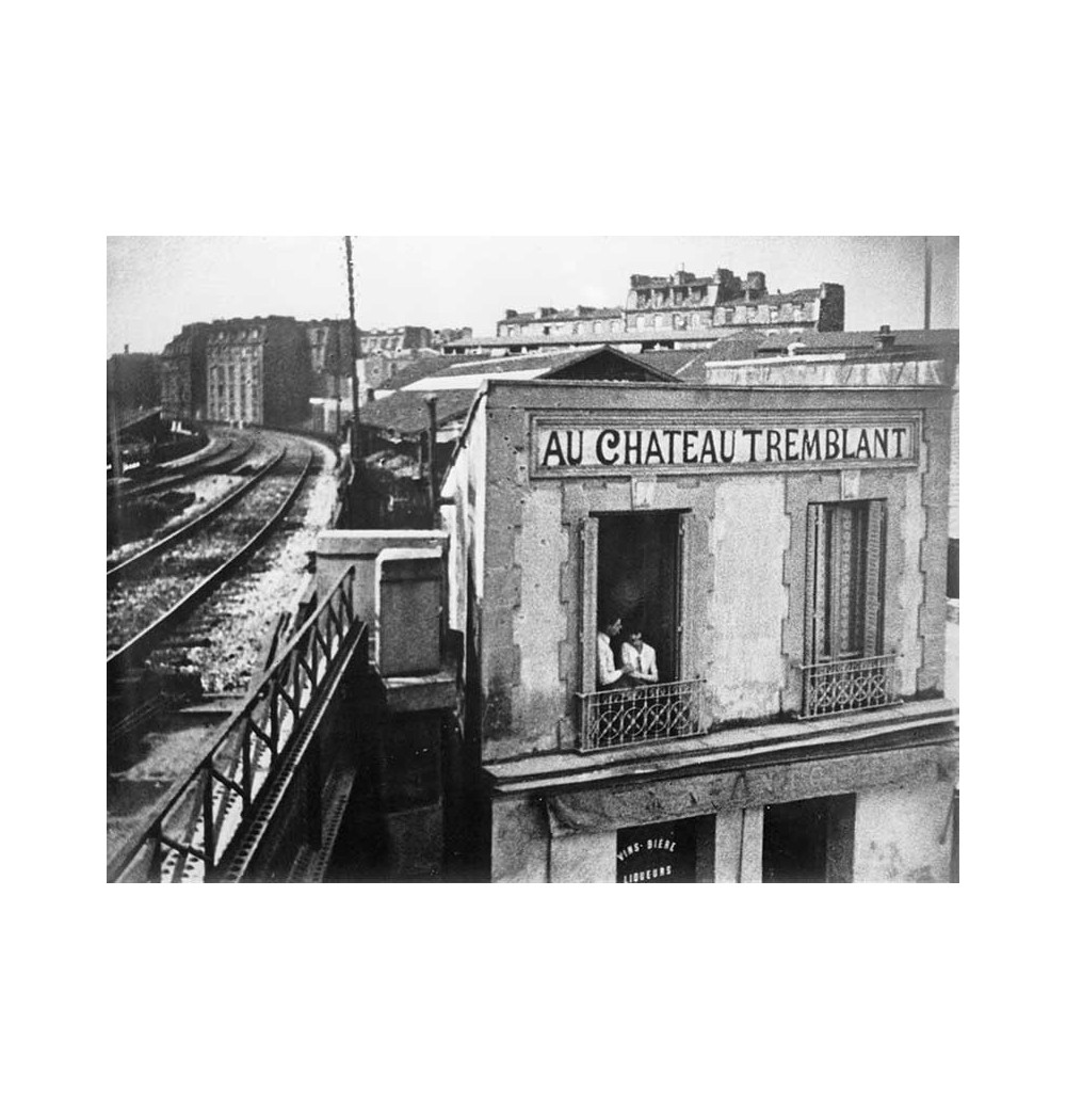 façade immeuble, voie de chemin de fer, couple à la fenêtre, incription "vin bière" sur fenêtre du bas