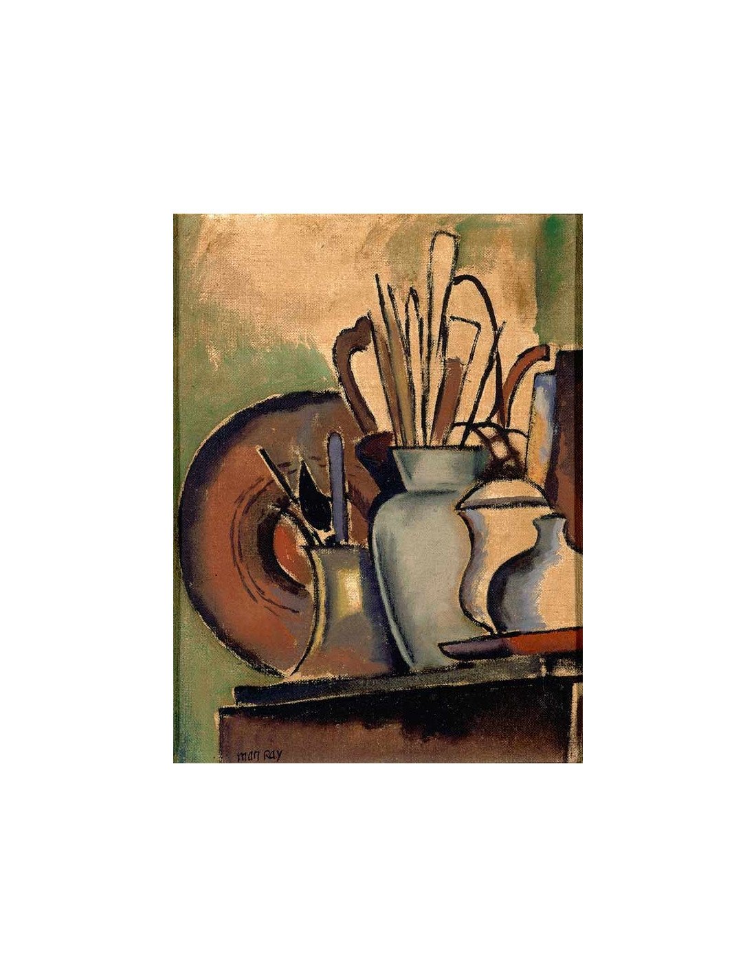 huile sur toile, nature morte, pot avec pinceaux sur une étagère
