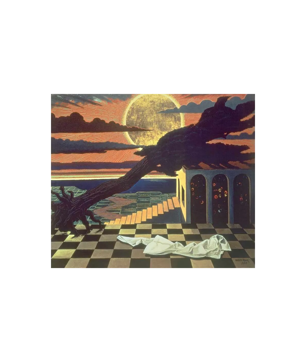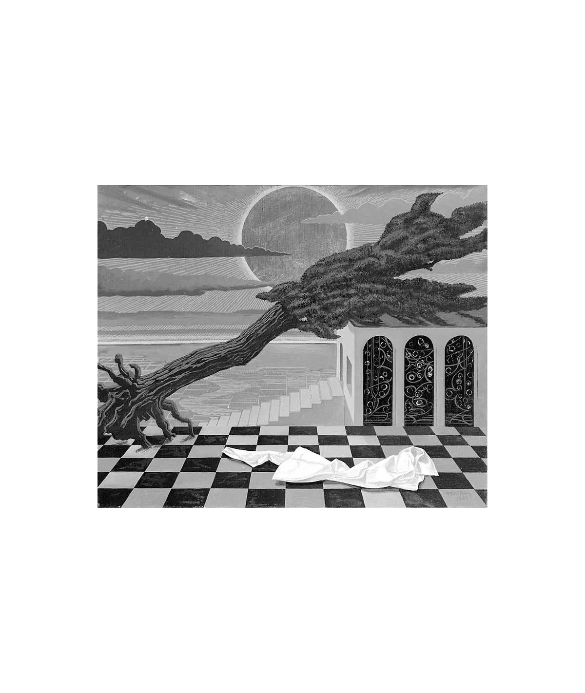 arbre couché sur maison, sol en damier avec un drap blanc échoué, soleil couchant avec nuages