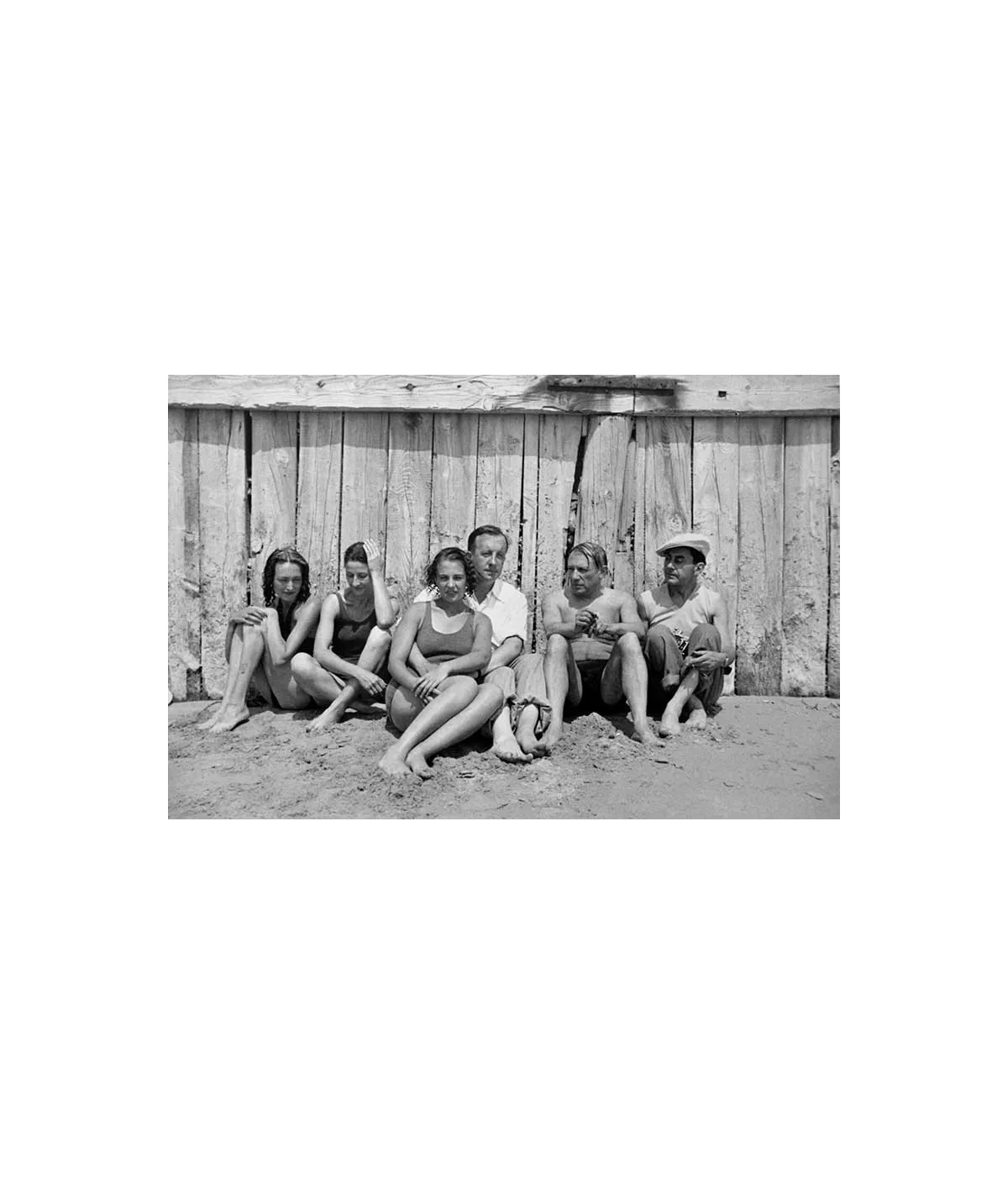Nusch Eluard, Valentine Penrose, Paul et Cécile Eluard, Pablo Picasso, Man Ray assis contre la palissade de la plage La Garoupe