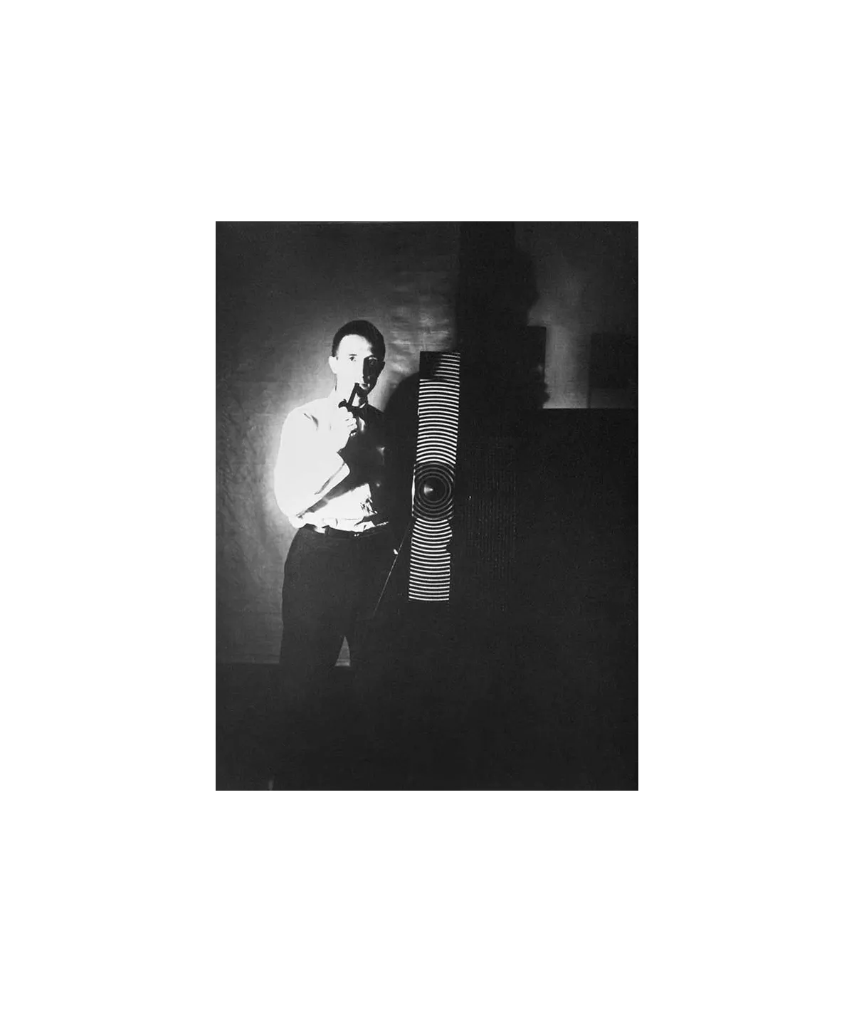 Marcel Duchamp derrière ses " Rotatives plaques de verre " en action
