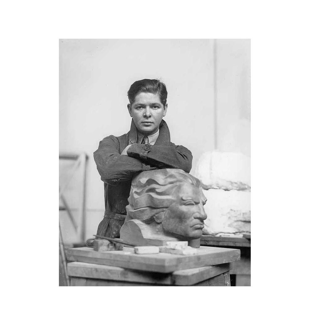 portrait homme sculpteur dans son atelier accoudé à une statue sur une stelle dans son atelier