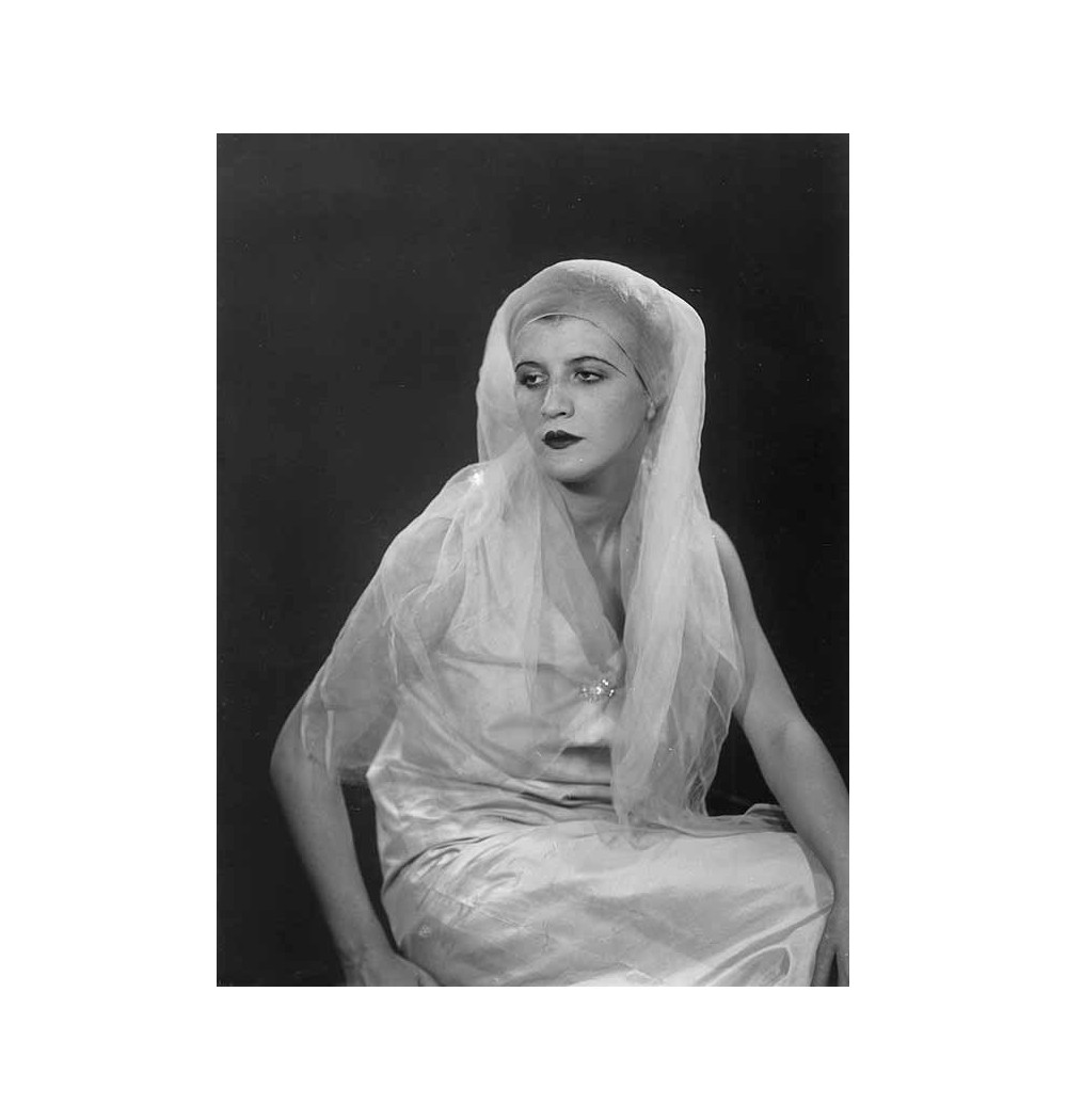 portrait femme de trois quart maquillée un voile sur la tête robe en satin blanc