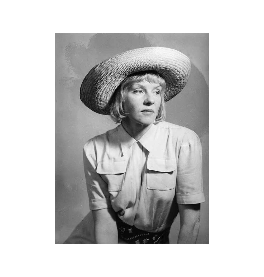 portrait femme portant grand chapeau de paille, cheveux blonds chemise claire