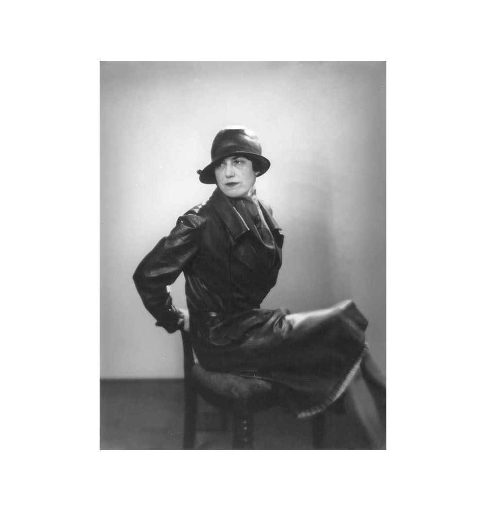 portrait femme assise les mains dans le dos veste en cuir et chapeau - fond clair