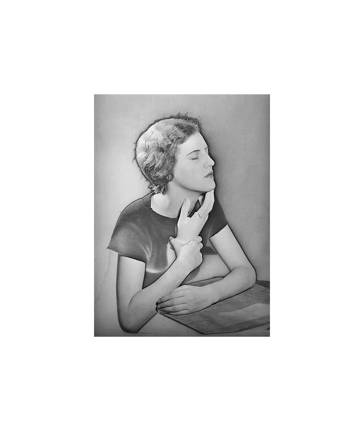 portrait de femme accoudée tenant une main de plâtre sous son menton - solarisation