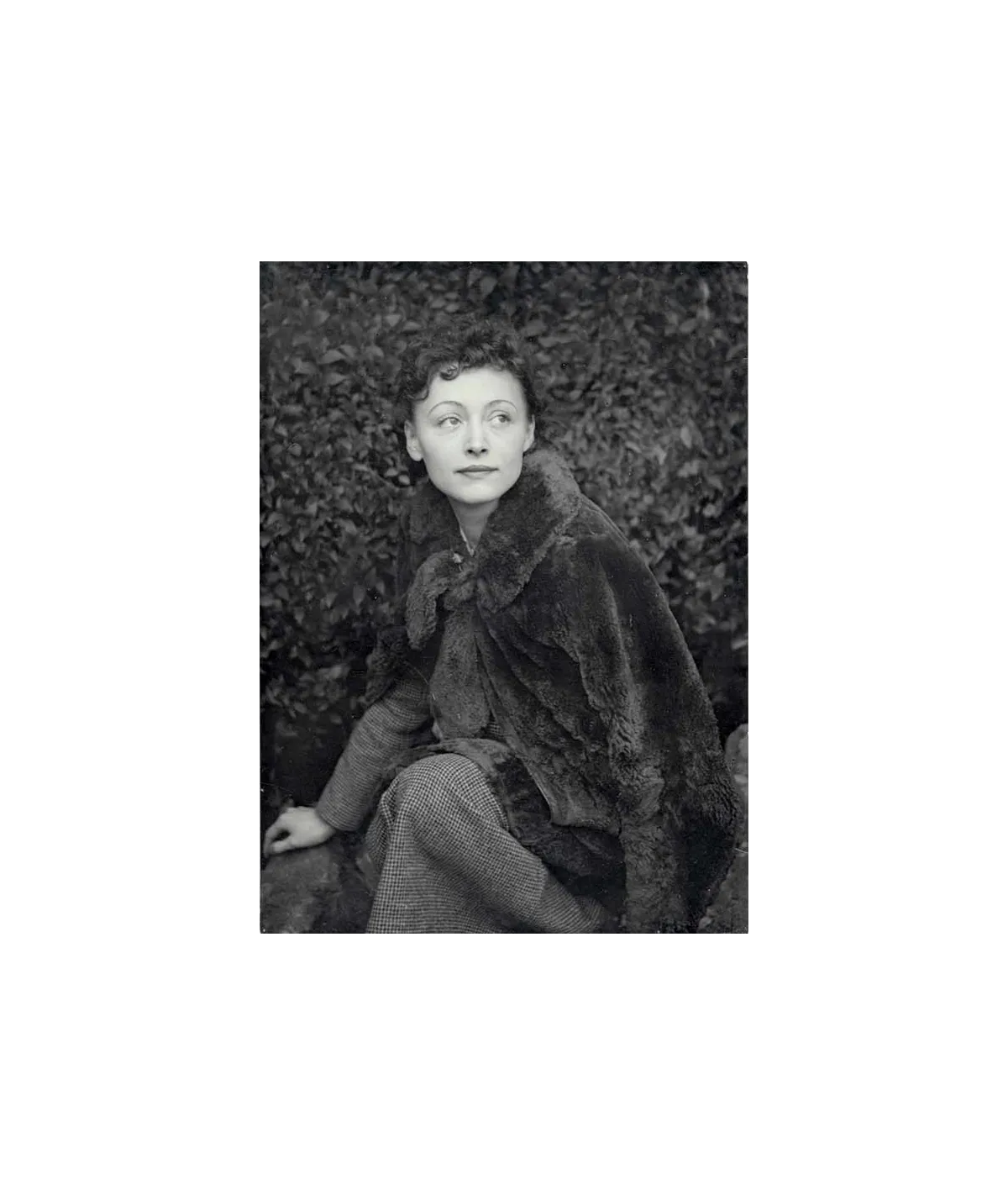 portrait femme accroupie dans un jardin devant feuillage en manteau en fourrure