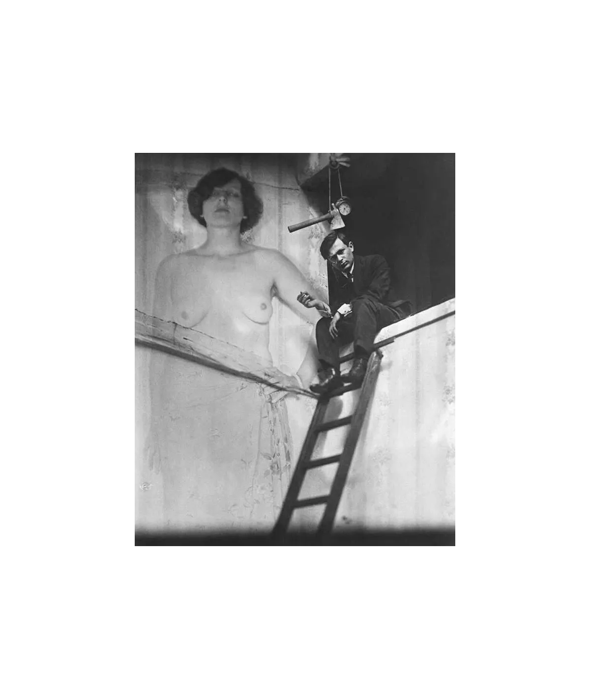 assis sous une hache échelle surimpression sur le mur d'une femme torse nu
