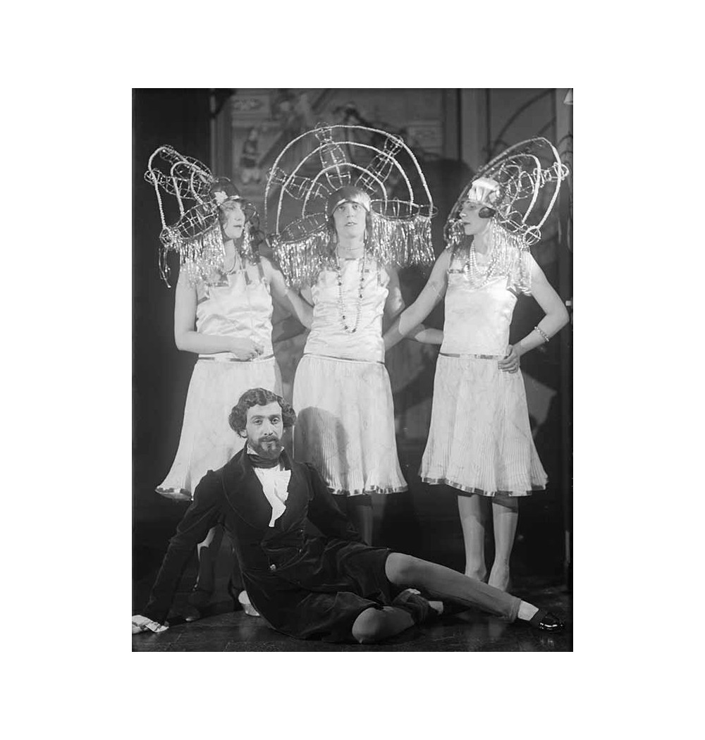 trois femmes déguisées avec des cerceaux derrière la tête et un homme couché devant, lors du Bal des tableaux célèbres donné par le comte de Beaumont, 31 mai 1924