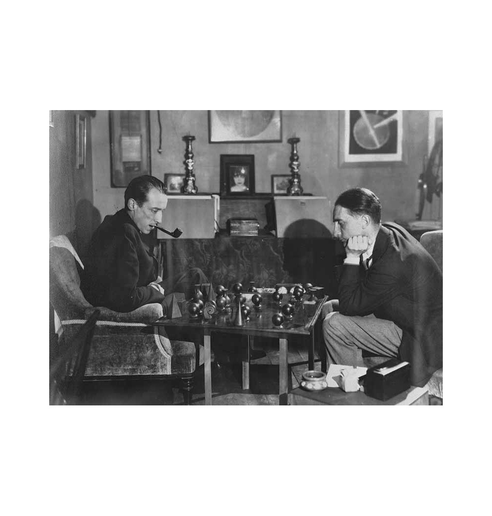 hommes assis jouant aux échecs dans le studio de Man Ray