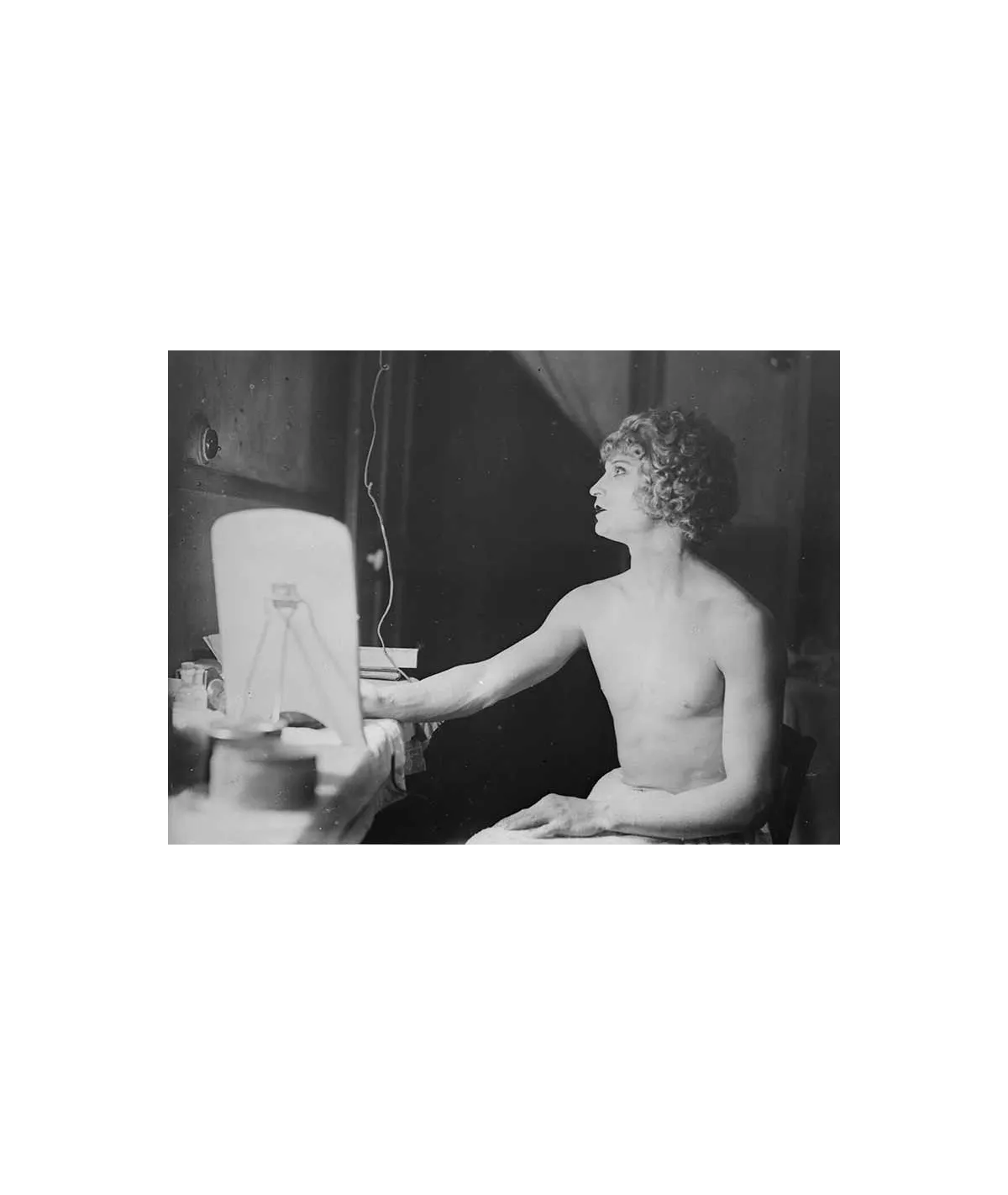 danseur travesti dans sa loge torse nu assis face à un miroir
