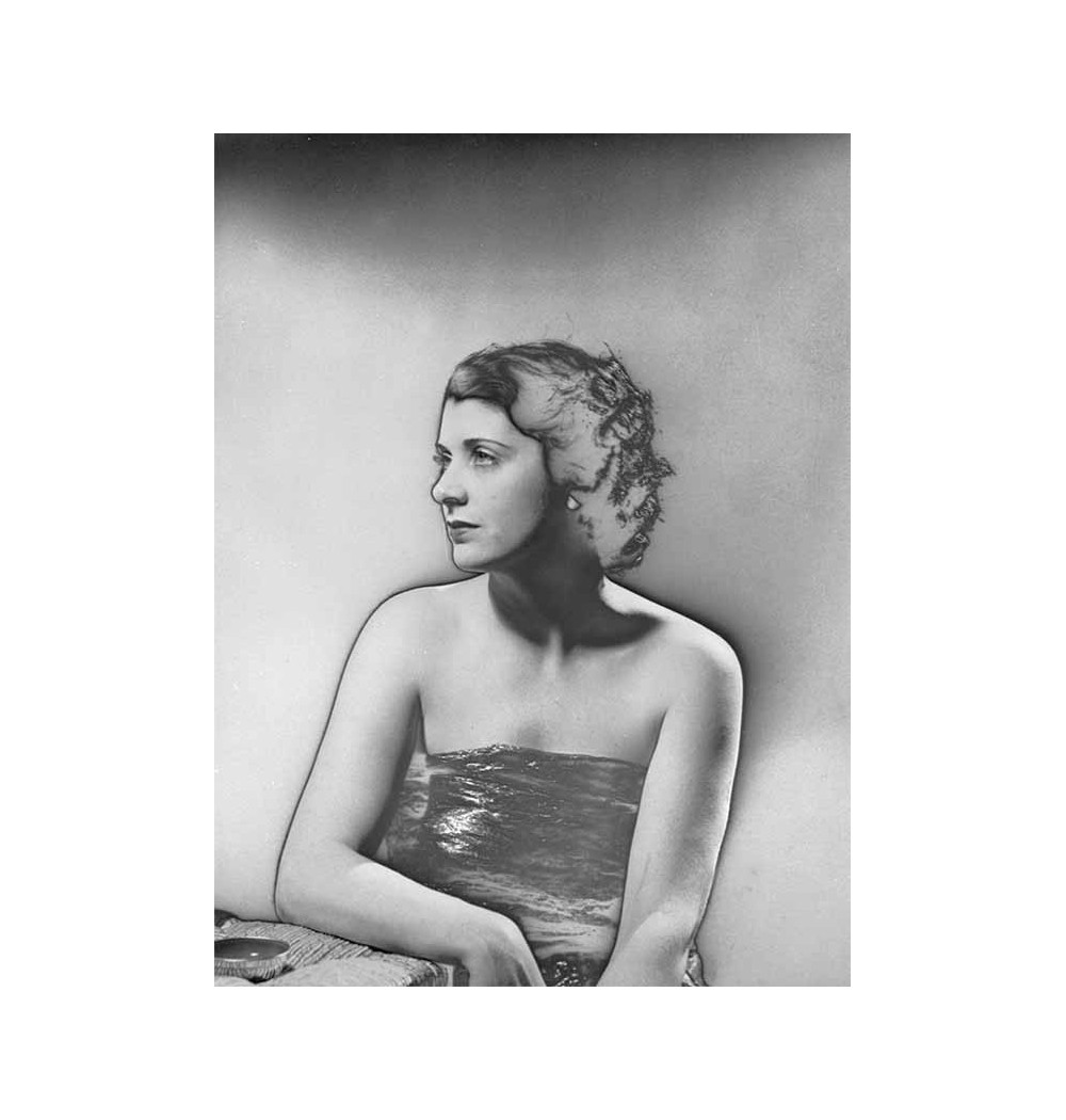 Femme en bustier assise et accoudée à une table - solarisation
