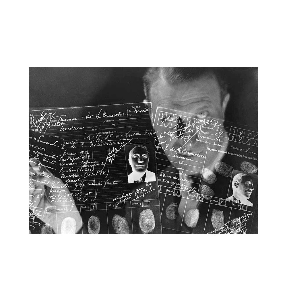 portrait homme et superposition photos d'identité et empreintes digitales en négatif