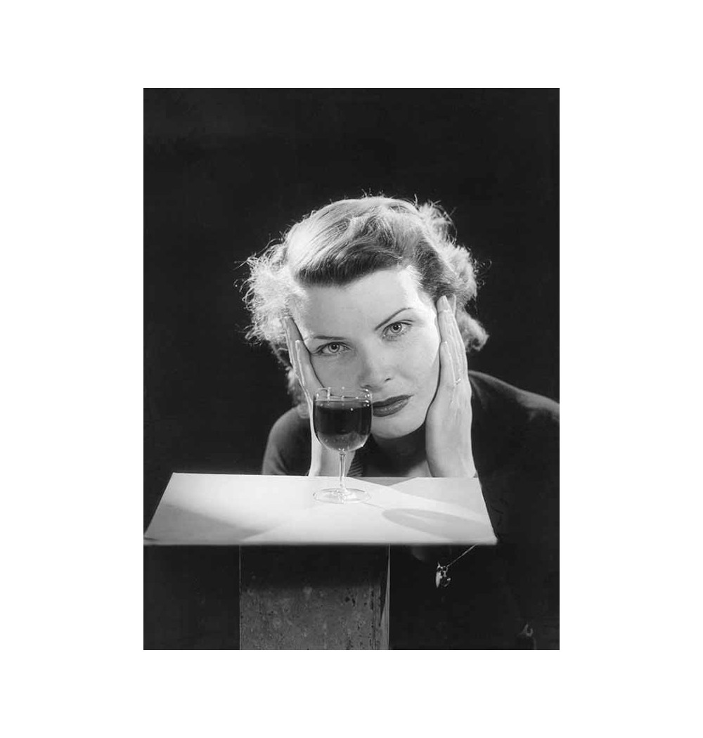 Mary Gill−Einstein, portrait femme de face tête entre les mains devant un verre de vin - fond noir