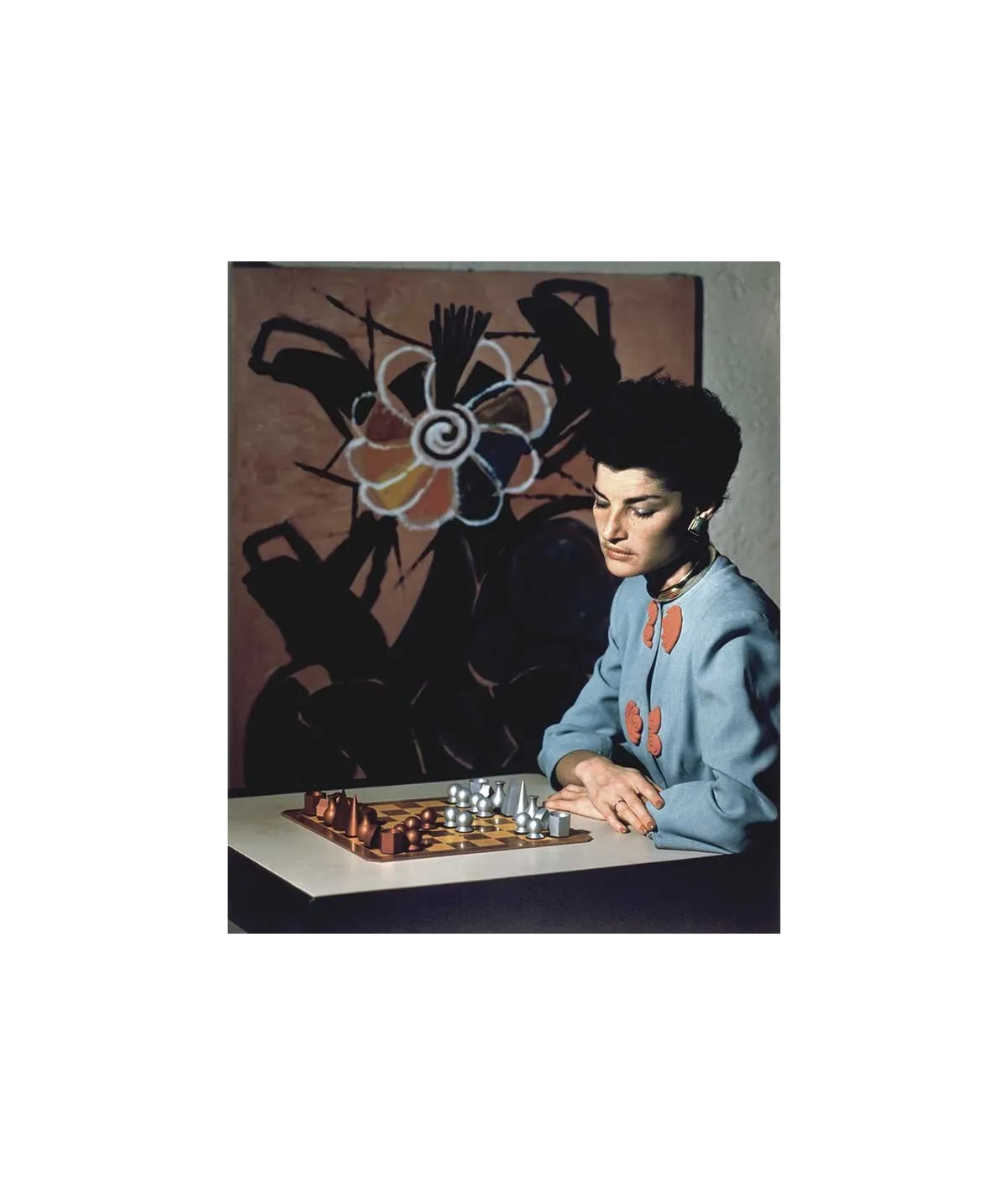 femme assise devant jeux d'échecs, tableau au mur en fond - couleur