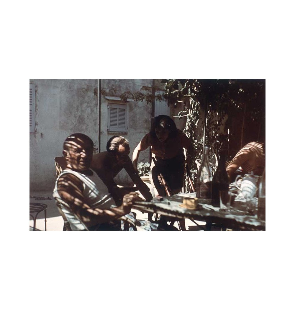 Vacances à Mougins, hôtel Vaste Horizon, groupe avec Pablo Picasso, Paul Eluard, non identifié, Cécile Eluard (cachée)