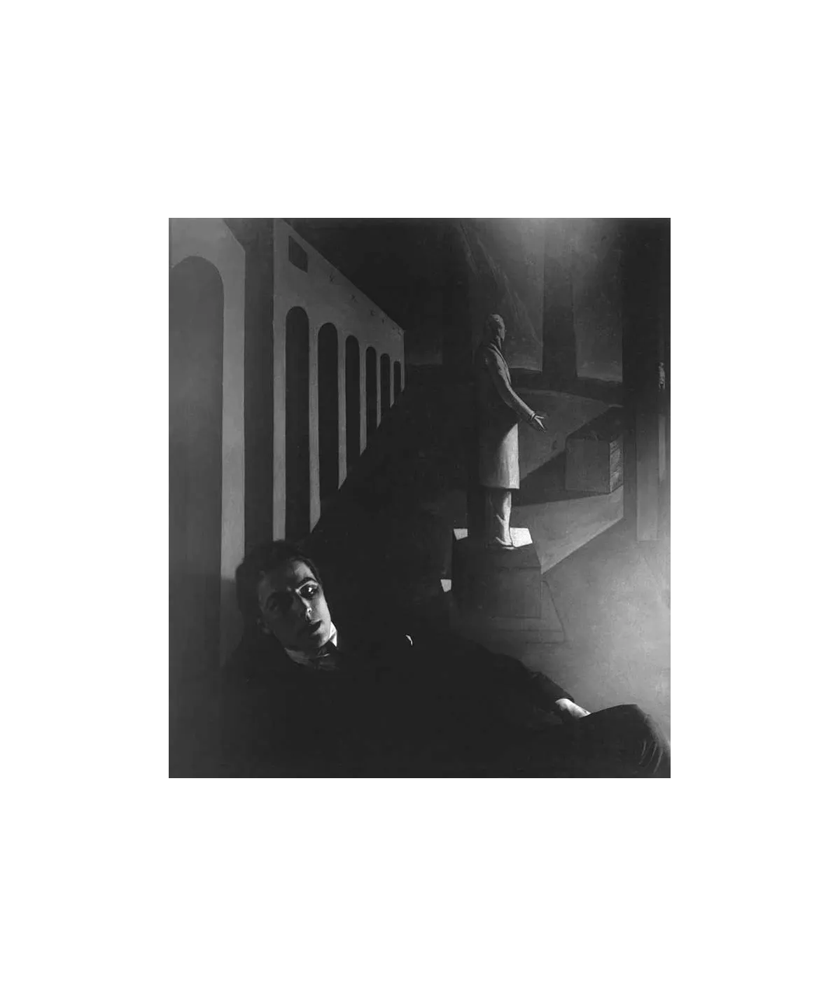 André Breton allongé devant un tableau “l’énigme d’une journée” de Giorgio de Chirico
